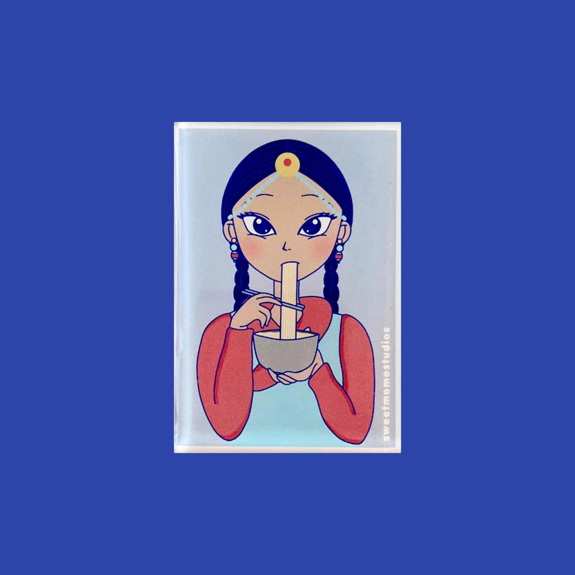 ★ Acrylic fridge magnet with hand-draw digital illustration of Tibetan girl eating thukpa (noodle soup).